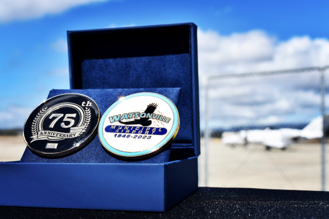 To commemorate 75 years since Naval Auxiliary Air Station Watsonville became Watsonville Municipal Airport, we are offering a serialized, limited edition challenge coin with the original airport logo on one side and 75th Anniversary with serial number on the other. This challenge coin serves as a wonderful gift and souvenir for those who like to keep their eyes to the sky and would like to share in a piece of our airport's history. Purchases will be in person only at the airport front office while supplies last.